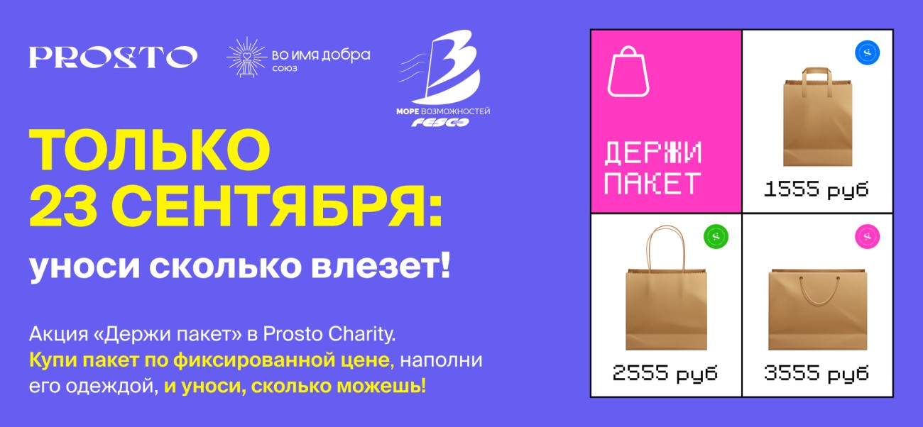 Только в субботу 23 сентября - приходите в магазин PROSTO, покупайте на кассе пакет по фиксированной цене и складывайте туда и уносите столько одежды, сколько влезет!